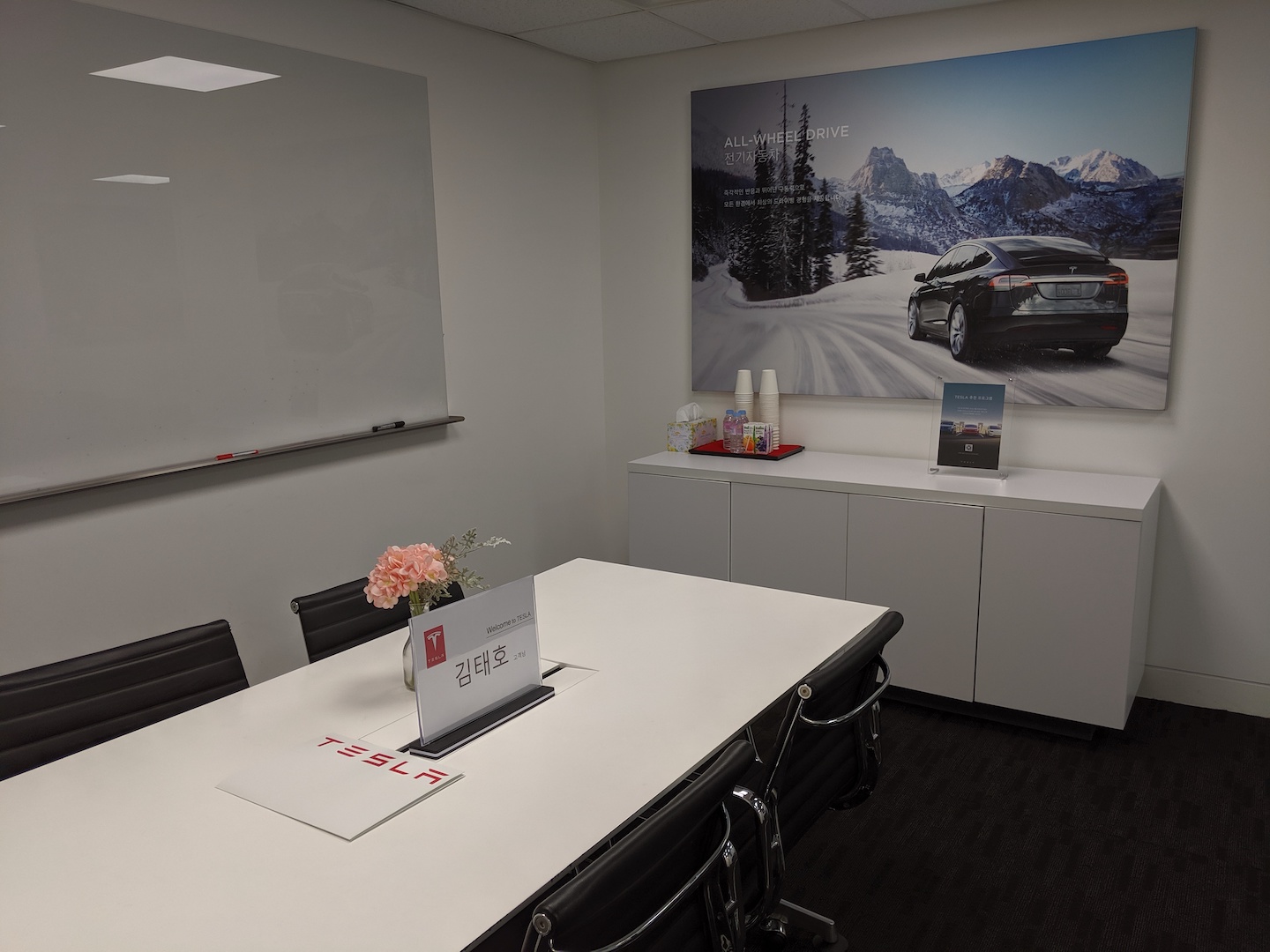 서비스센터에 도착하면 2층에 있는 방에서 차량 인도를 위한 서류 작업을 마무리하게 됩니다. 방 내에 비치된 책상에는 차량 인수를 위한 서류와 이름이 인쇄되어 있는 명패가 큼지막하게(!) 놓여있습니다. :)